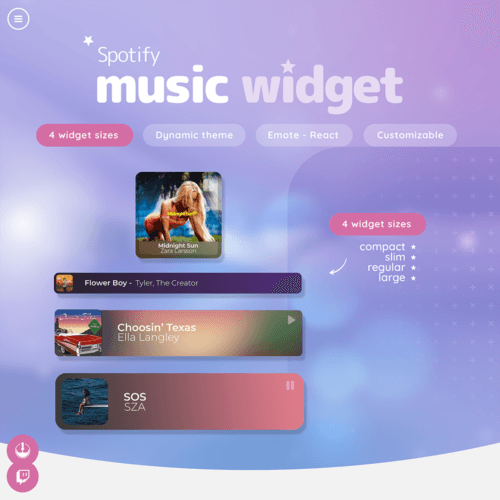 Dynamic Spotify Now Playing widgets designed for Twitch streamers, boosting viewer engagement, showcasing your music in real time, and elevating your stream’s overall experience.